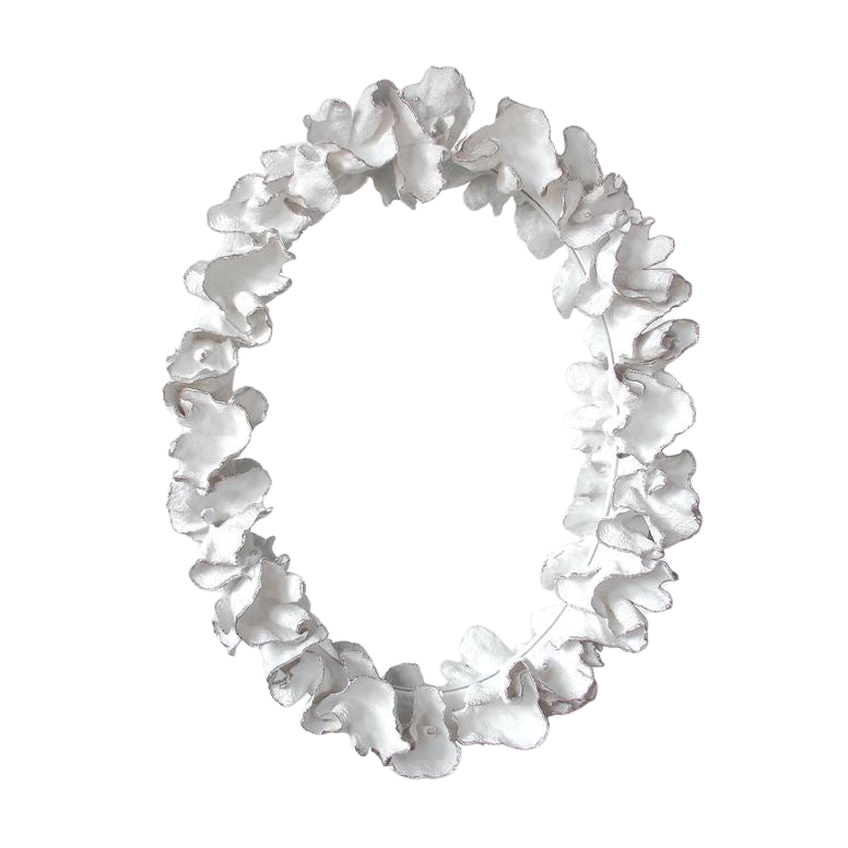Leaf coral was the inspiration for this remarkable piece. Hours of molding and hand painting are necessary to fashion the Coco's undulating oval of white coral. For a less casual interpretation, a thin silver or gold tip is applied to the end of each leaf.