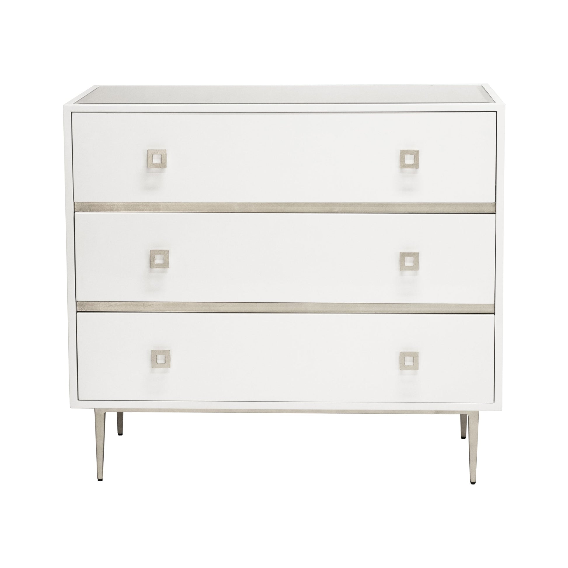The Hudson 3-drawer white lacquer chest, by World's Away,  features your choice of gold or silver leaf hardware & base, and a beveled mirror top.