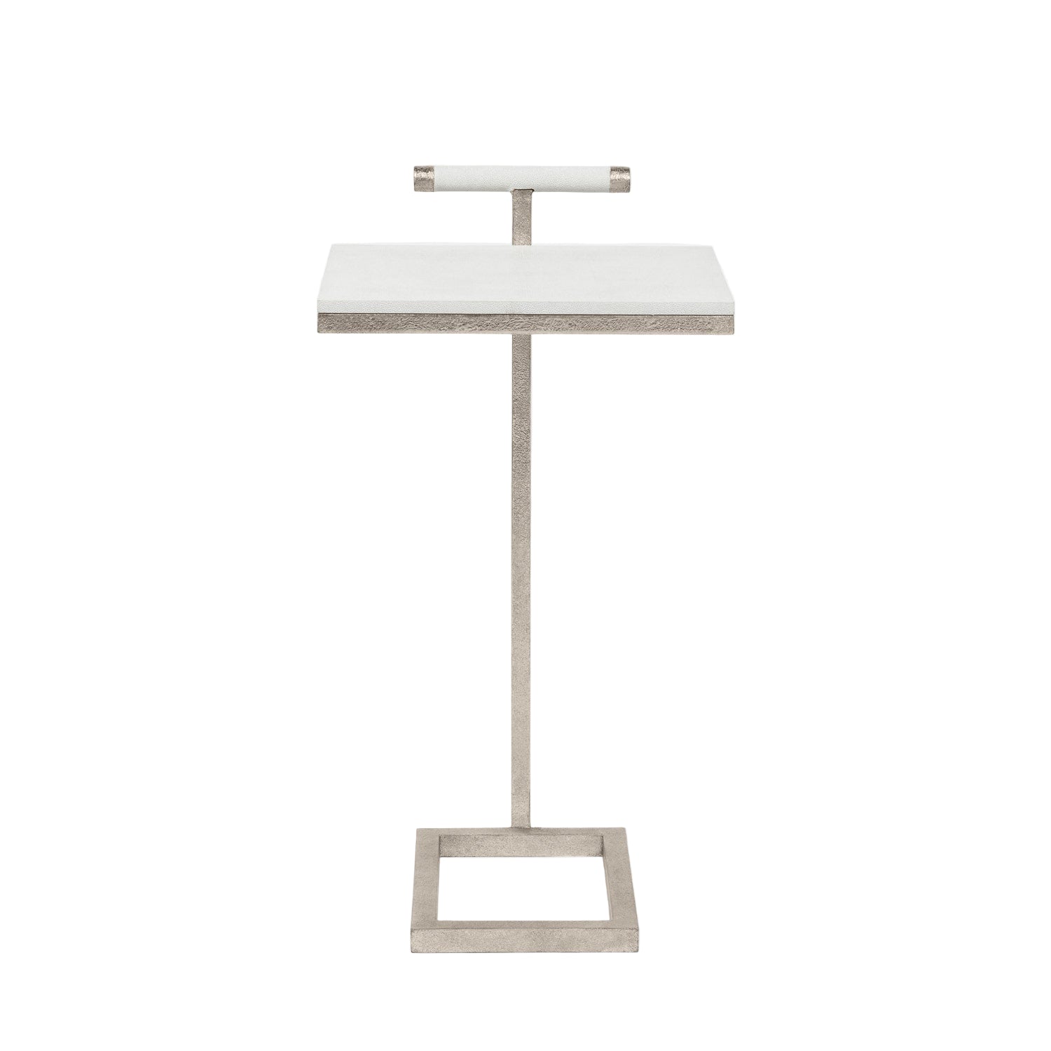 Our extremely portable Ellery is the perfect table for simple couch-side convenience. A minimal metal base is topped with a faux shagreen panel and handle; use it for drinks, to hold a laptop while working, or to keep anything you need within arm's reach.