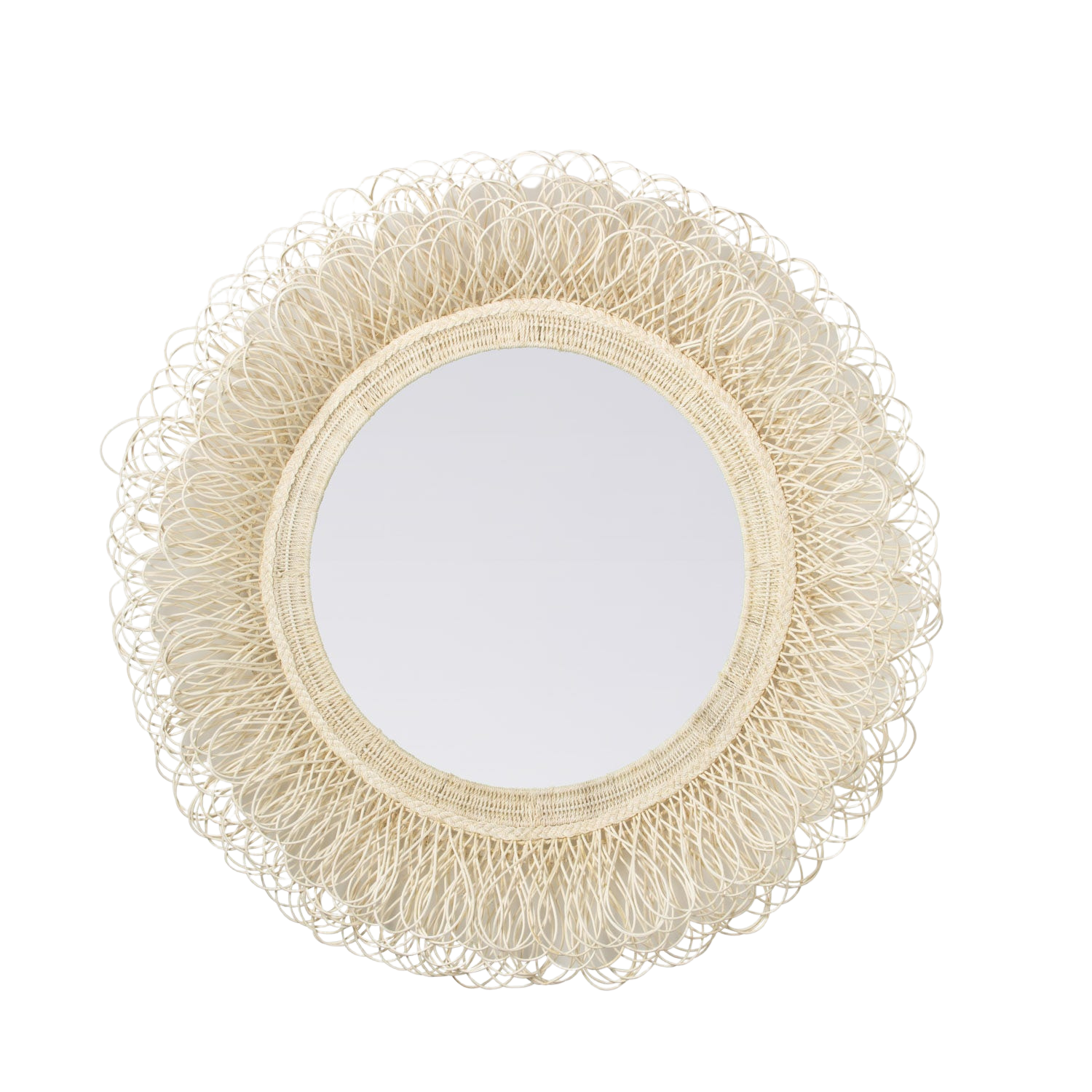 Created by hand, voluptuous loops of natural rattan, corralled by a wide row of thick rattan braids, encircle a round mirror. A beautiful addition to your modern coastal home!