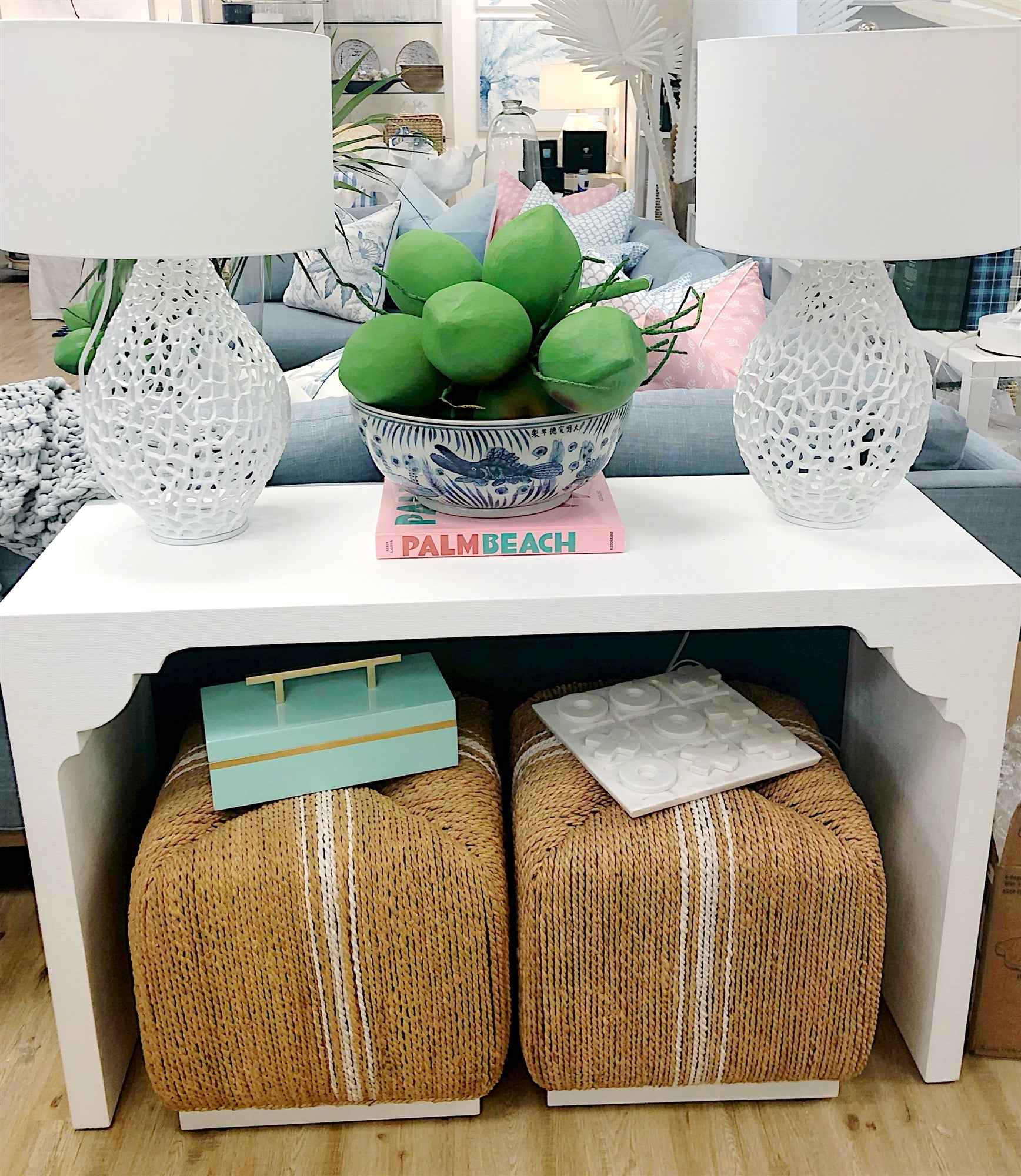 This crisp white console was inspired by a love of crown molding. A simple waterfall shape comes alive with this molding detail and texture of durable faux jute. Top with a set of beautiful lamps for a stunning addition to your entry or living room.
