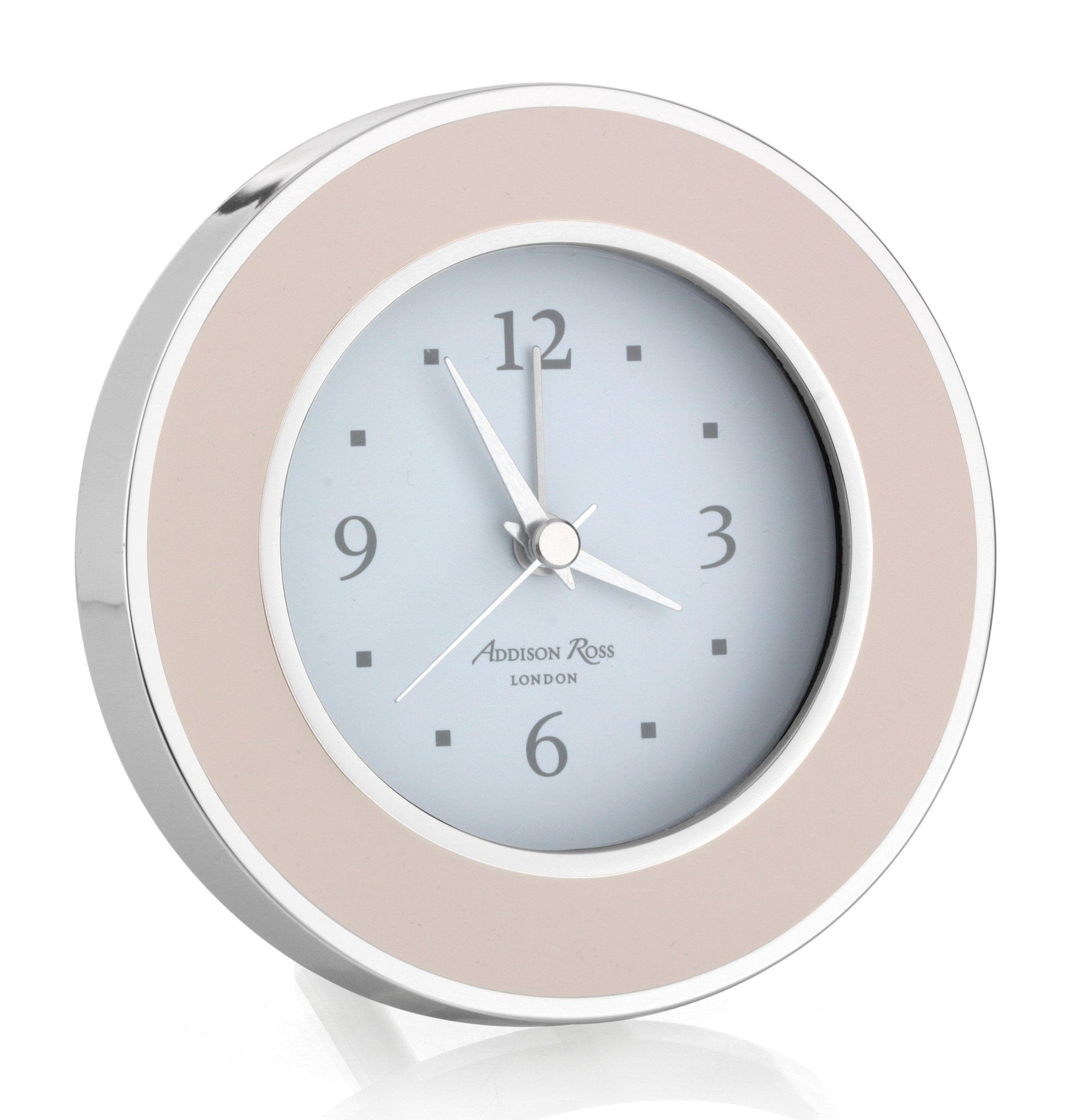 Our light pink enamel alarm clock with silver trim beautifully compliments our enamel frames, complete with an alarm function, this clock is ideal for a bedside table or desk. Backed in luxury grey velvet with a silver clock movement cover. This clock features a silent sweep movement making it the perfect addition to a bedside table. You will not hear the ticking but you will of course hear the alarm!