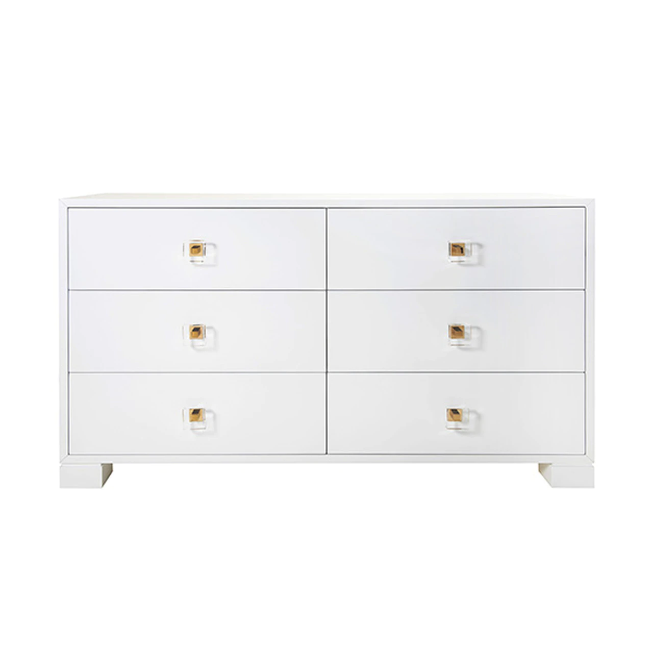 Update your bedroom's style with the addition of this fresh, contemporary dresser. Eclectic in design, this furnishing simple rectangular silhouette catches the eye with bold details. Geometric lines complete the look. Six drawer dresser with brass or nickel and acrylic hardware in white lacquer.