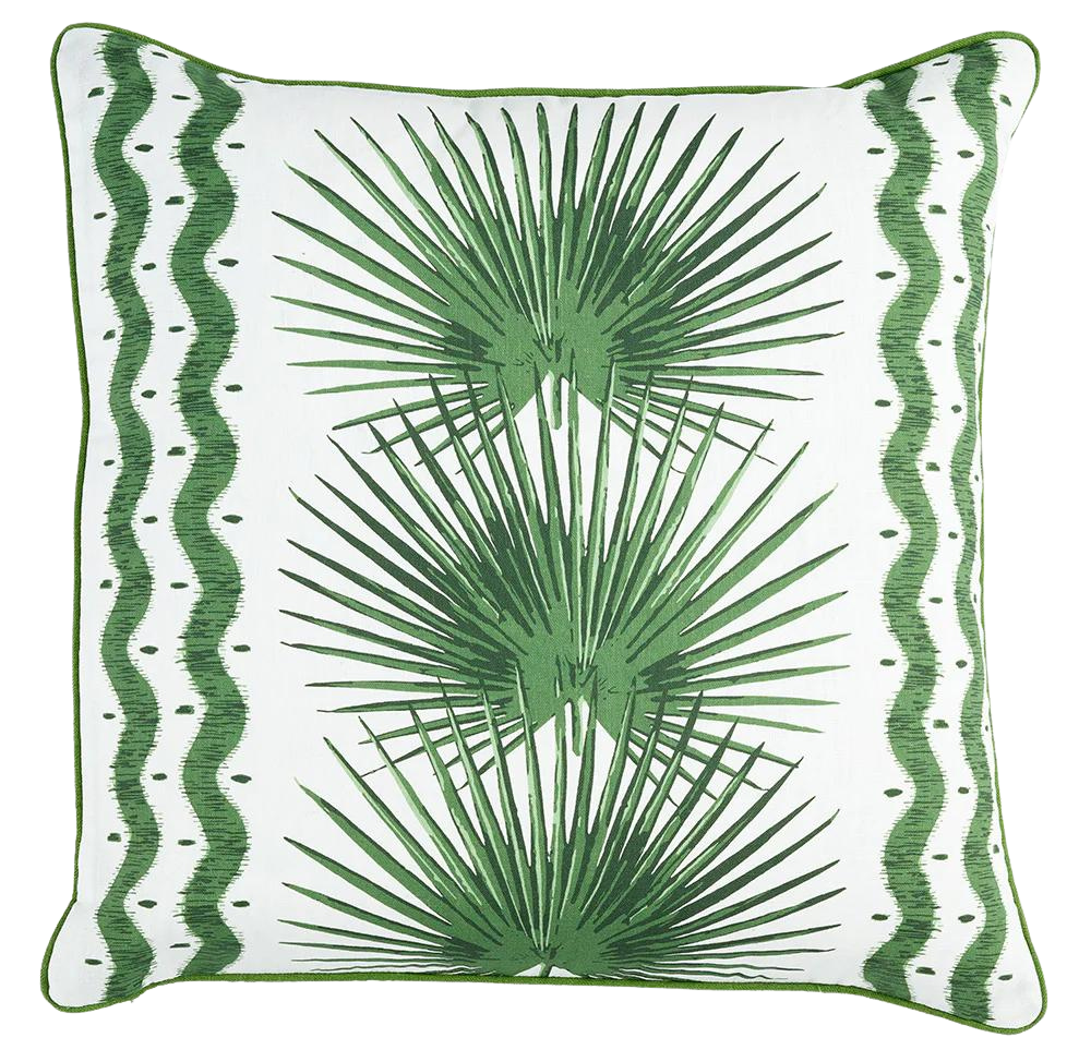 Unwind in paradise with the Palmette pillow, featuring a linen kelly green pipe and back. Let the relaxing palms transport you to a state of tranquility and comfort.