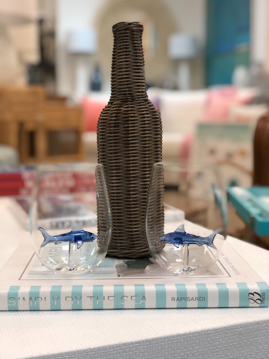 These hand blown glasses are accented with a blue shark inside to swim in your beverage! A perfect pairing to any beach day. Sold in a set of 6, these make fun gifts, too.