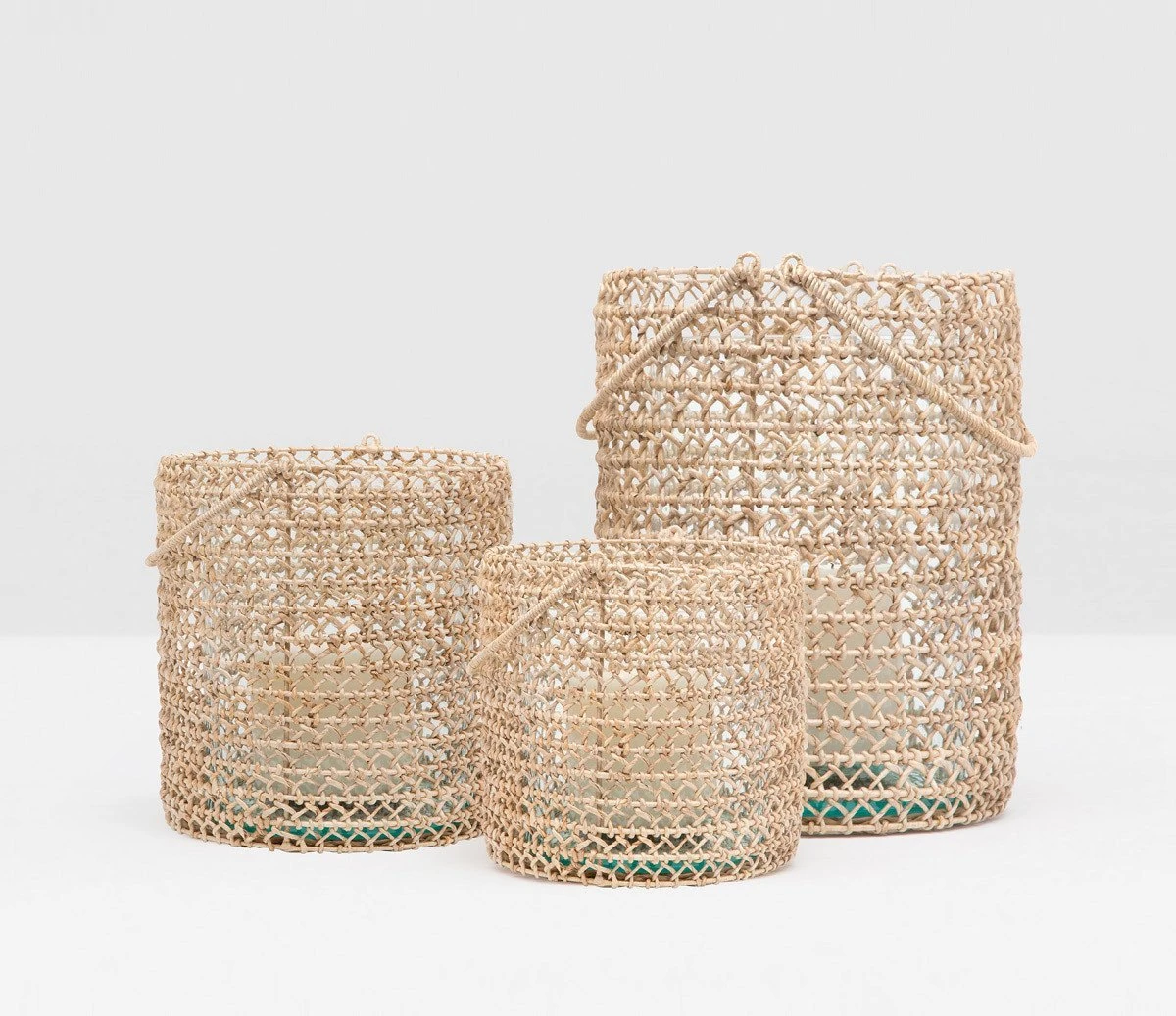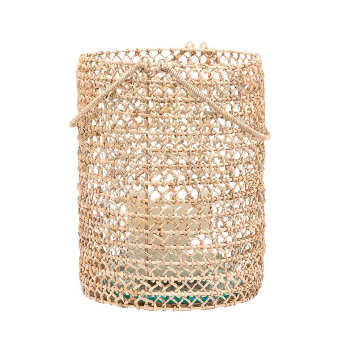 The large knotted weave of banana bark creates the breezy look of this natural hurricane. A single, centered handle on the smaller sizes, and one loop on each side of the larger one, makes for easy transport.