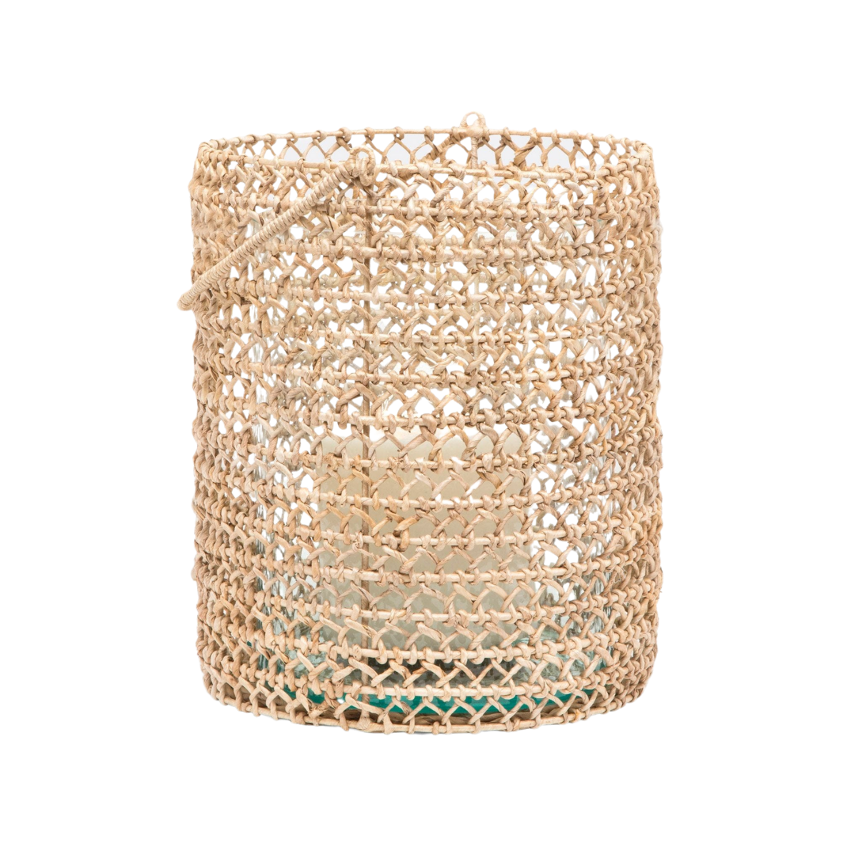 The large knotted weave of banana bark creates the breezy look of this natural hurricane. A single, centered handle on the smaller sizes, and one loop on each side of the larger one, makes for easy transport.