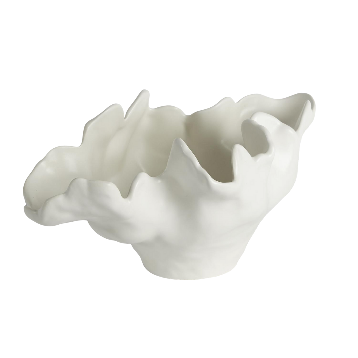 This ceramic white bowl is the perfect centerpiece for your dining table or entry console. The white matte finish with wavy edge is truly art for your table. The original of this grand statement piece was created by a Portuguese artist whose work first caught our designers' eyes at an art fair in Portugal. It took years of collaboration to arrive at this design that can be consistently produced. Multiple pieces are cast, bound together, and fired. Then it receives a reactive glaze and is fired a second time. There is a tremendous amount of artisan work that goes into every piece. Entire rooms could be designed around this beautiful and functional sculpture.